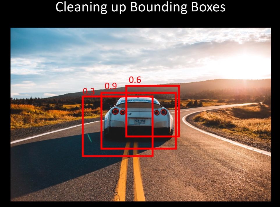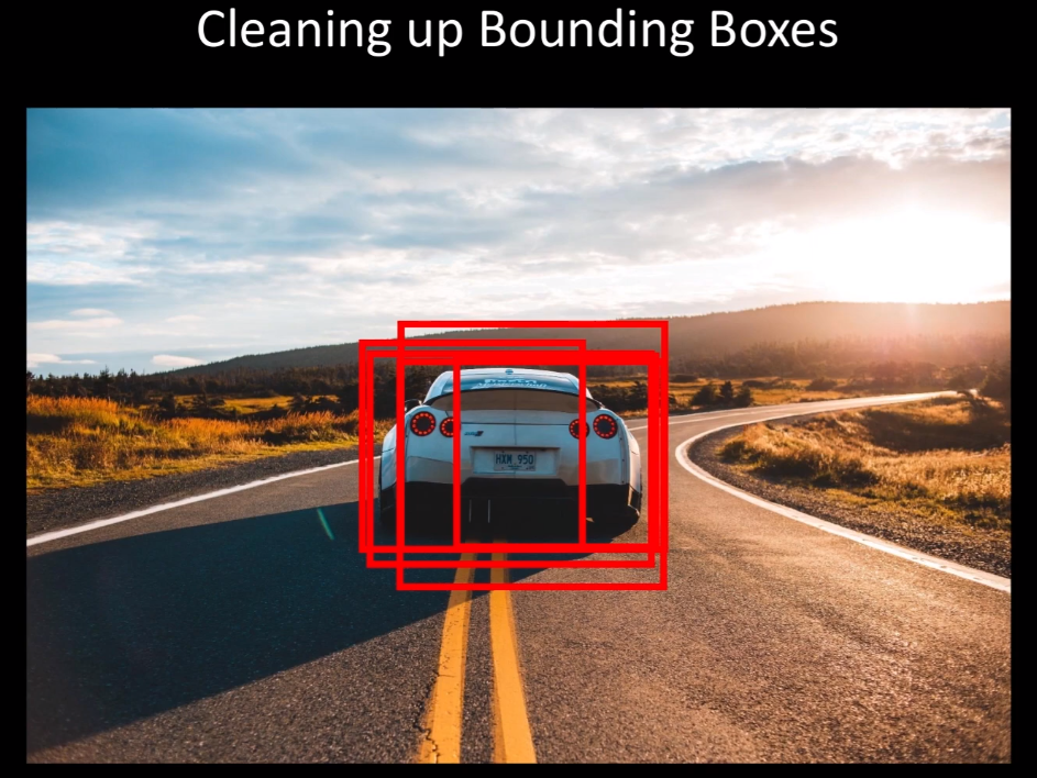 모델이 위 그림과 같이 box를 예측했다고 해보자. 어떤 박스는 자동차를 거의 완벽하게 내포하고 있고 몇몇 박스는 조금씩 아쉽게 위치한 것을 볼 수 있다. 여기서 우리가 원하는 것은 이 박스들 중에 자동차를 가장 잘 포함시킨 박스 하나만 남겨서 깔끔하게 만드는 것이다. 이러한 작업은 어떻게 이루어 질까?