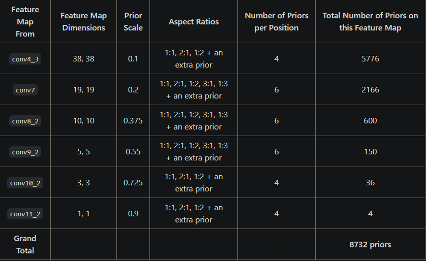 각각의 Feature_map에서 각 그리드 셀마다 4개 혹은 6개의 prior box가 있으며 (conv4_3 에서는 38 x 38 x 4 = 5776 개의 prior box) prior box의 비율은 기본적으로 1:1, 2:1, 1:2, an extra prior(조금 더 스케일이 큰1:1)를 가지고 있으며 6개를 가진 feature_map은 추가적으로 3:1, 1:3의 비율도 가지고 있다.