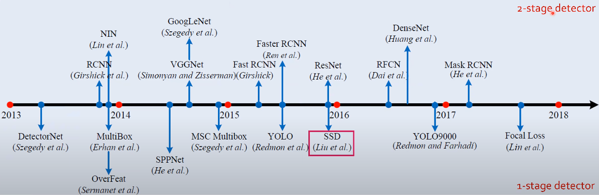 SSD : Single Shot Multibox Detector는 2016년 ECCV(European Conference on Computer Vision) 학회에서 발표되었다. 이름에서부터 알 수 있듯이 Object Detection 논문이며 당시 SOTA였던 Faster_RCNN 과 YOLO v1의 단점들을 보완하면서 화제가 된 논문이다.