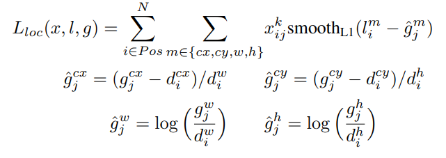 x : 이미지의 k라는 클래스에 대해서 i번째 default box와 j번째 ground truth의 매칭이 1이라면(즉 물체가 있다면) loss를 구하게 되고 0이라면 넘어가게 된다. (IOU가 0.5 이하이면 loss를 계산하지 않겠다.)