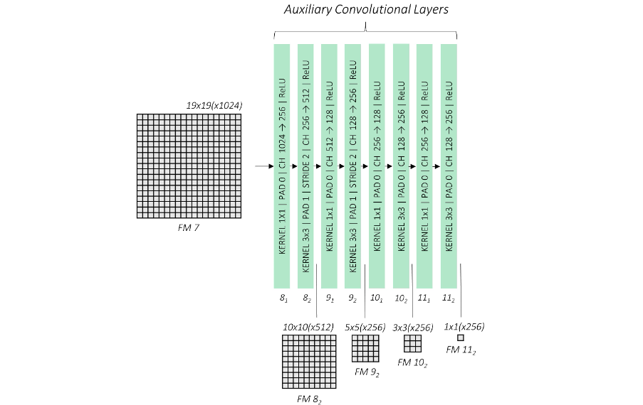 VGG network에 이어서 위와 같은 레이어 들을 추가적으로 붙였고 전체 레이어에서 총 6개의 Feature_map에서 예측을 하고 최종적으로 Non-Max Suppression을 진행하는 구조로 되어있다.