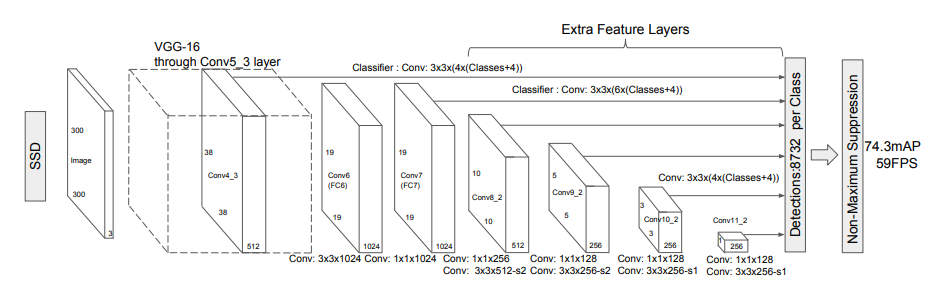 SSD는 입력 이미지로 300 x 300 의 resolution을 사용하며(SSD300인 이유) Base network으로 시작이 된다. Base network는 VGG16을 사용하였는데 모든 레이어를 그대로 가져온 것이 아니라 기존의 FC6와 FC7 레이어를 사용하는 대신 convolution으로 대체하면서 채널수를 줄이는 선택을 하였다.