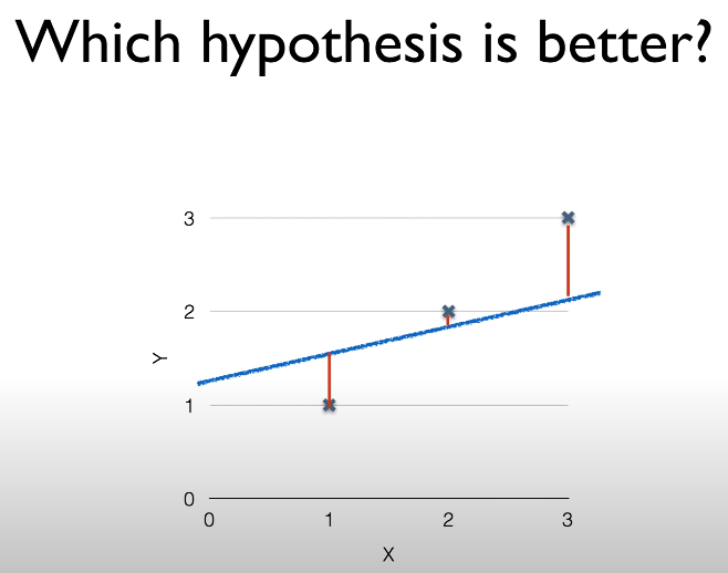 바로 위의 그림을 보면 알 수 있듯이 우리의 가설인 H(x) 직선과 데이터 사이의 빨간 선 즉 오차가 있을 것이고 이 오차를 줄이게 된다면 직선은 점점 데이터의 점들에 가까워 지게 될 것이다.