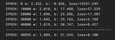 실제로 섭씨를 화씨로 변환하는 식은 F = 1.8 * C + 32 인데 결과값을 보면 W가 1.809로 b가 31.394로 거의 실제 식과 유사해진 것을 볼 수 있다.