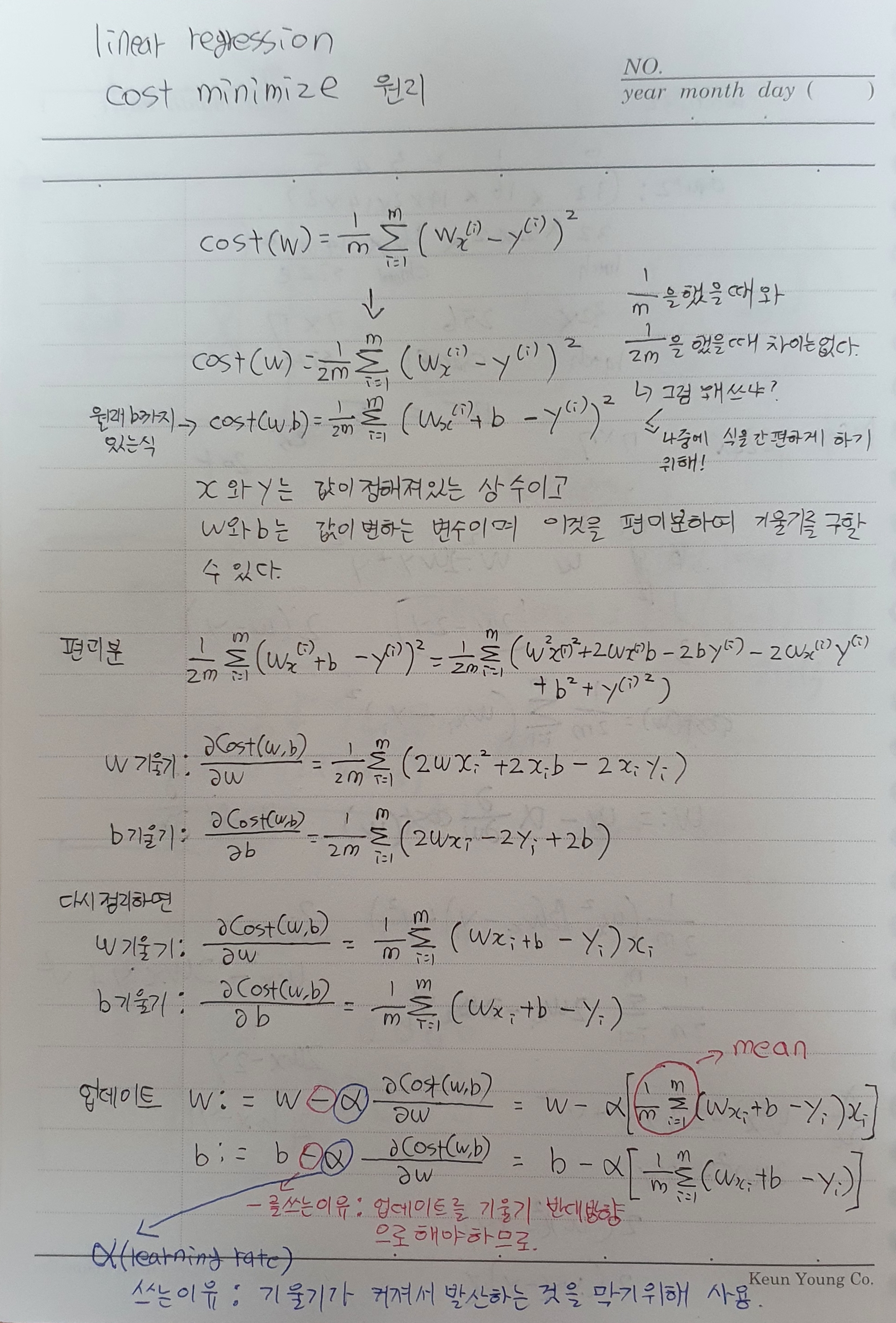 위의 사진처럼 편미분을 하여 W와 b의 기울기를 얻게되고 최종적으로 업데이트 할 W와 b 식을 구할 수 있게 된다. 그렇게 업데이트 된 W와 b를 통해 우리는 다시 H(x) 즉 Ŷ(예측) 을 세울 수 있고 이 가설은 파라미터들을 기울기만큼 움직였으므로 Cost가 낮아져 이전 가설보다 Y(정답)과 더 가까워 지게 되는 것이다. 즉 추세선이 정답을 근사해 갔다고 할 수 있다.