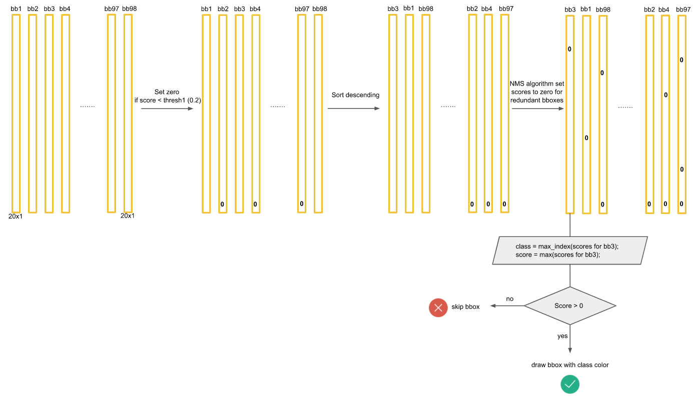 먼저 1440개의 값중에 0.2(Threshold)보다 작은 값들은 모두 0으로 만든다. 그 후에 클래스별로 내림차순으로 정렬을 하고 NMS 기법을 통해서 최종 detection output을 만들어 낸다. NMS는 아래 포스팅에서 자세히 다뤘으니 넘어가겠다.