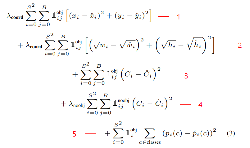 YOLO v1은 위와같은 Multi Loss를 사용하였다. 특이한 점은 CrossEntropy가 아닌 SSE(Sum Square Error)를 사용했다는 것인데 구간별로 천천히 살펴보자