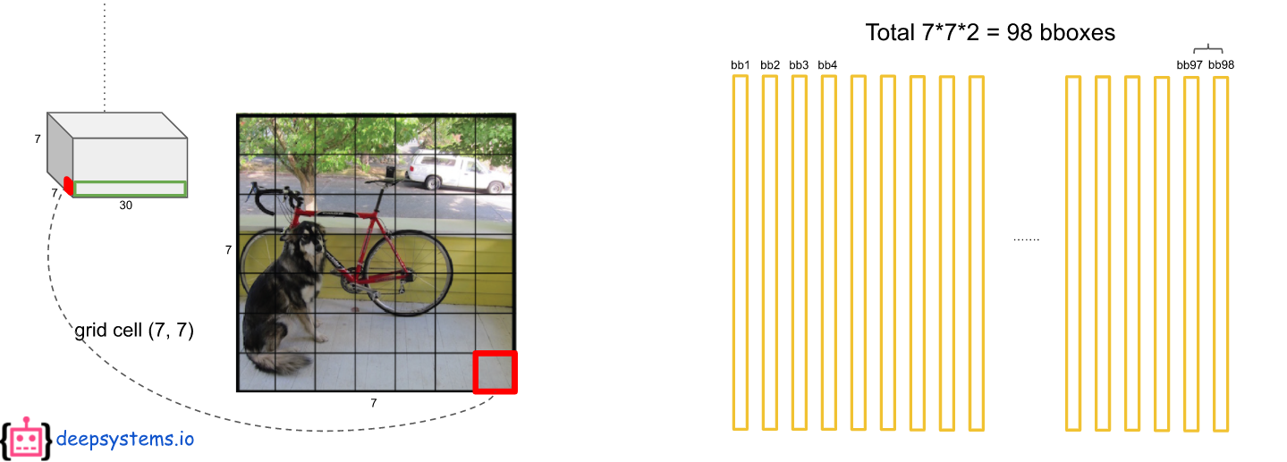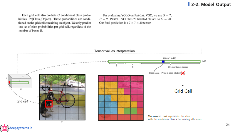 모델의 최종 feature map은 7 x 7 x 30의 사이즈를 가지고 있게 되고 이것을 49개의 영역의 grid cell로 보고 각 grid cell에서 2개의 bounding box와 class를 예측을 하게 된다.