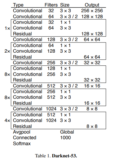 Joseph Redmon은 backbone network로 YOLO v1에서는 GoogLeNet, YOLO v2에서는 Darknet19, 그리고 이번에는 Darknet53을 사용하였다. Darknet53은 아래 그림과 같이 구성되어 있으며 눈여겨 볼 것은 ResNet의 skip connection을 사용하였다는 점이다. 또한 1x1 convolution을 통해 연산량을 줄였으며 결과적으로 다른 classification network보다 조금더 좋은 성능을 내게된다.