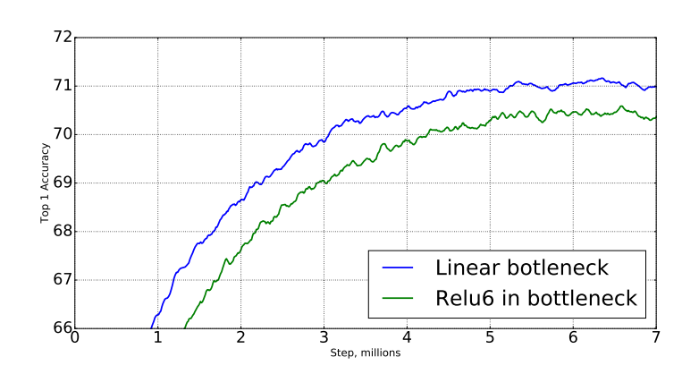 그렇기 때문에 아래 그림처럼 Expansion Layer에서는 ReLU6를 사용하지만 Projection Layer에서는 Low-dimension 데이터를 출력하기 때문에 여기에 non-linearity를 사용하게 되면 데이터의 유용한 정보들이 손실된다는 것이 논문의 주장이다.
