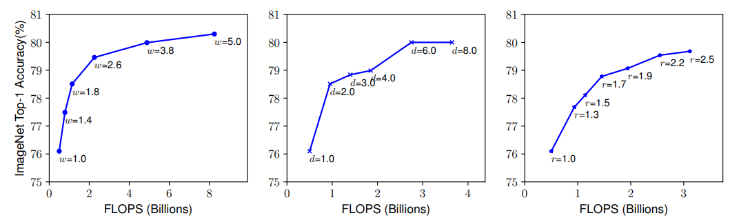 위 그래프는 각각 width, depth, resolution을 키웠을 때의 FLOPS(Floating point Operation Per Second)와 Accuracy를 보여준다. width, depth, resolution 모두 80% accuracy까지만 빠르게 saturate(포화)되고 그 이후로의 성능향상은 한계가 있을을 알 수 있다.