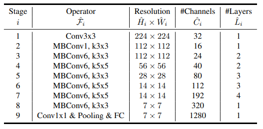 - 위 그림은 scaling을 하지 않은 기본 B0모델 구조이다. Operator의 MBConv는 Mobilenet v2에서 제안된 inverted residual block을 의미하고 바로 옆에 1 혹은 6은 expand ratio이다.