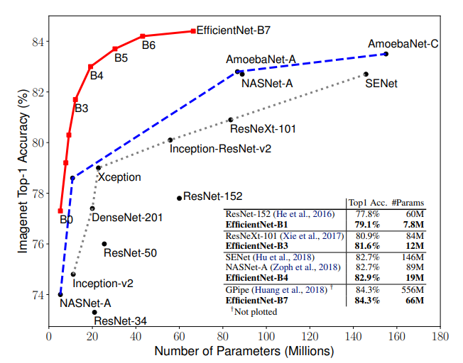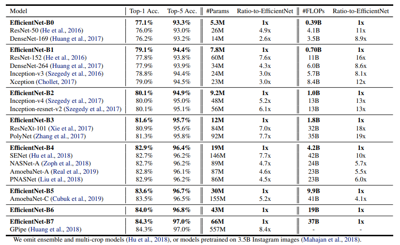 위 차트는 ImageNet dataset에 대한 성능 지표이고 EfficientNet의 B0~B7 까지 각각의 성능과 비슷한 SOTA모델을과 비교를 하고 있다. 같은 성능 대비 파라미터와 FLOPS가 EfficentNet 모델들이 압도적으로 적은 것을 볼 수 있다.