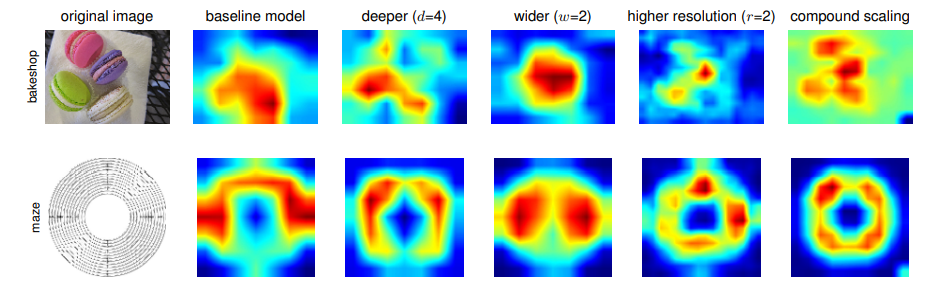 위 그림은 width, height, resolution을 각각 따로 scaling up 했을때와 compund scaling 했을때의 Class Activation Map을 나타낸 사진이다. compound scaling이 각각의 객체들을 잘 담고 있으며 좀더 정확한 것을 볼 수 있다.