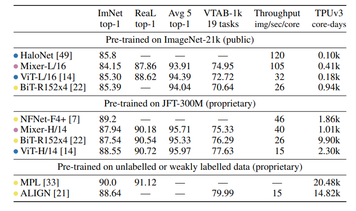 - MLP-Mixer가 SOTA의 성능까지는 보여주지 못하지만 충분히 다른 모델들과 경쟁력이 있는 것을 볼 수 있다.