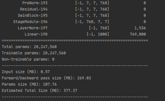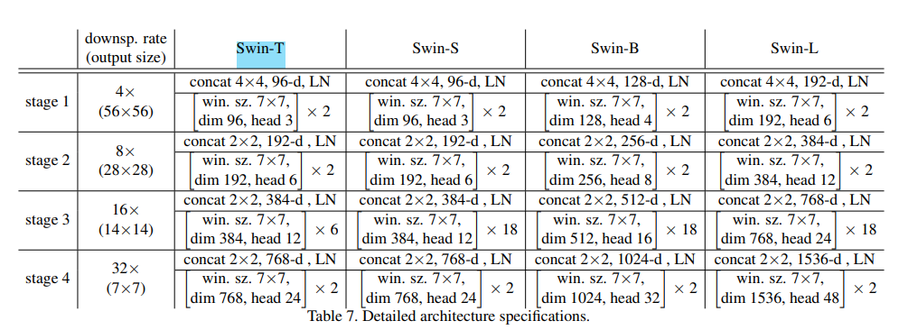 - Swin Transformer는 위와같이 4개의 모델이 있는데 그중 Swin-Tiny에 대한 구현 코드이다.