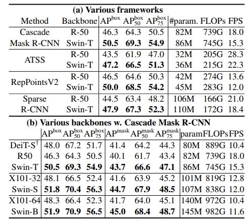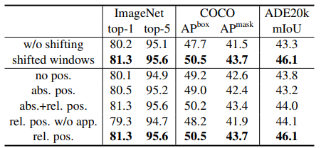 - SW-MSA없이 W-MSA만 사용했을때보다 둘다 사용했을때의 성능이 더 좋았고 abs positition embedding(기존에 사용하던 절대좌표) 과 relative postition embedding을 둘 다 쓰는 것 보다 relative postition embedding 하나만 사용하는 것이 제일 좋았다고 한다.