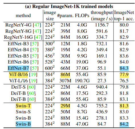 - ImageNet dataset에 대해 ViT base model보다 파라미터 수는 훨씬 적지만 성능은 3.4%가 높다. (노란색)