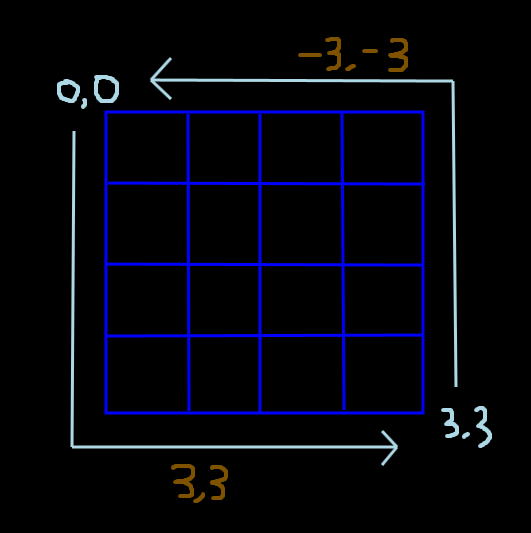 - 예를들어 위와같은 4x4 픽셀이 있을때 0,0 픽셀에서 3,3 픽셀로 이동을 하기 위해서는 3,3만큼 이동해야 한다.