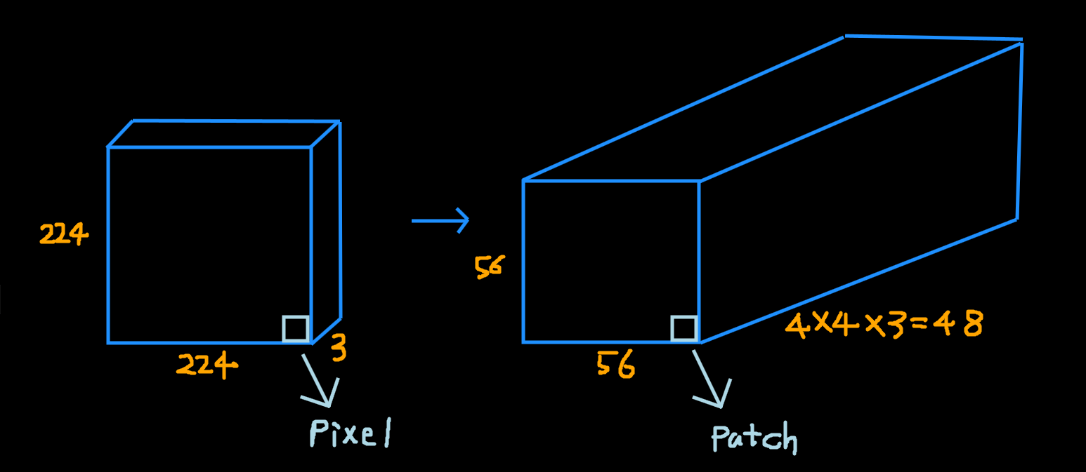 - 여기서 중요한 것은 이미지에서 한 점은 pixel이지만 Patch Partition을 하게되면 한 점이 patch가 되고 각 patch의 픽셀정보들이 channel이 된다.