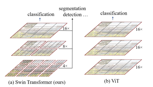 - 반면에 Swin Transformer에서는 마치 feature pyramid network처럼 작은 patch 4x4에서 시작해서 점점 patch들을 merge 해나가는 방식을 취한다.
