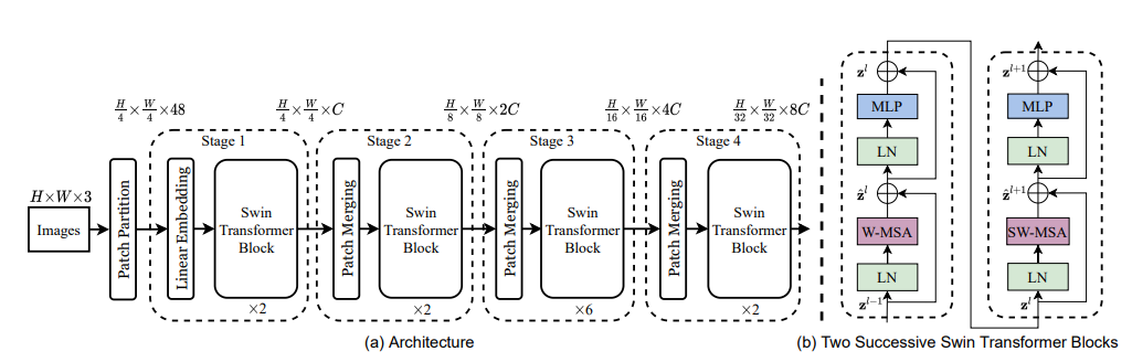 - 각 stage 위에 적혀있는 H/4 x W/4 x C 는 patch x patch x channel이며 48은 초기 patch size x channel (4x4x3)으로 구해졌으며 C는 base model인 Swin-T에서 96을 사용한다.