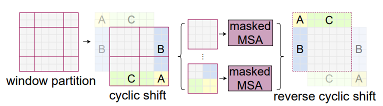 - 먼저 window를 shift시키는데 이것을 cyclic shift라고 부른다. window size // 2 만큼 우측 하단으로 shift하고 A,B,C구역을 mask를 씌워서 self-attention을 하지 못하도록 한다.