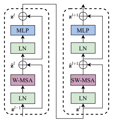 하나의 Block에는 두개의 Encoder로 구성이 되어있으며 ViT와 다른점은 기존에 사용하던 MSA가 아니라 Windows-MSA, Shifted Windows-MSA라는 점이다.
