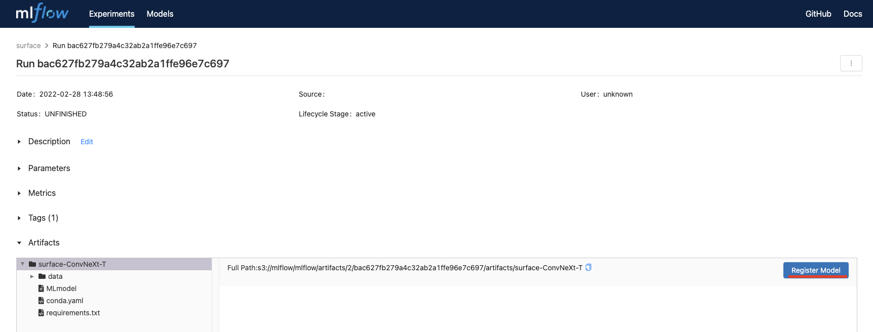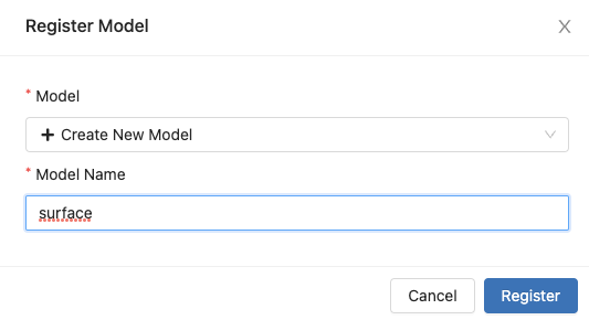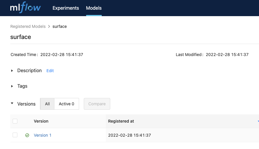 이전에 저장된 모델 name이 없다면 새로운 이름으로 모델을 정의할 수 있다. 이제 이 프로젝트에서 다루는 모델은 surface라는 이름으로 Versioning 할 수 있다.
