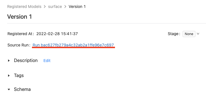 Models 메뉴로 들어가서 생성된 surface 모델을 클릭하면 좌측 그림과 같은 화면이 나오게 되며 이로서 이전에 실행된 Experiments가 하나의 버전으로 관리가 되는 것이다. Version 1을 클릭하면 우측 그림에 보이는 것 처럼 해당 Version의 Experiments run id를 확인할 수 있다.