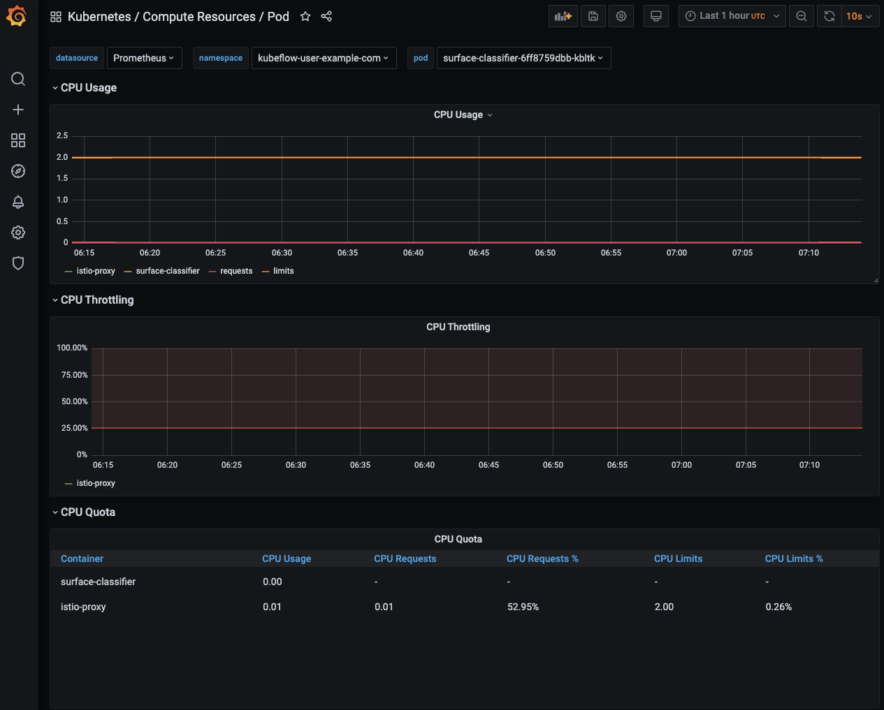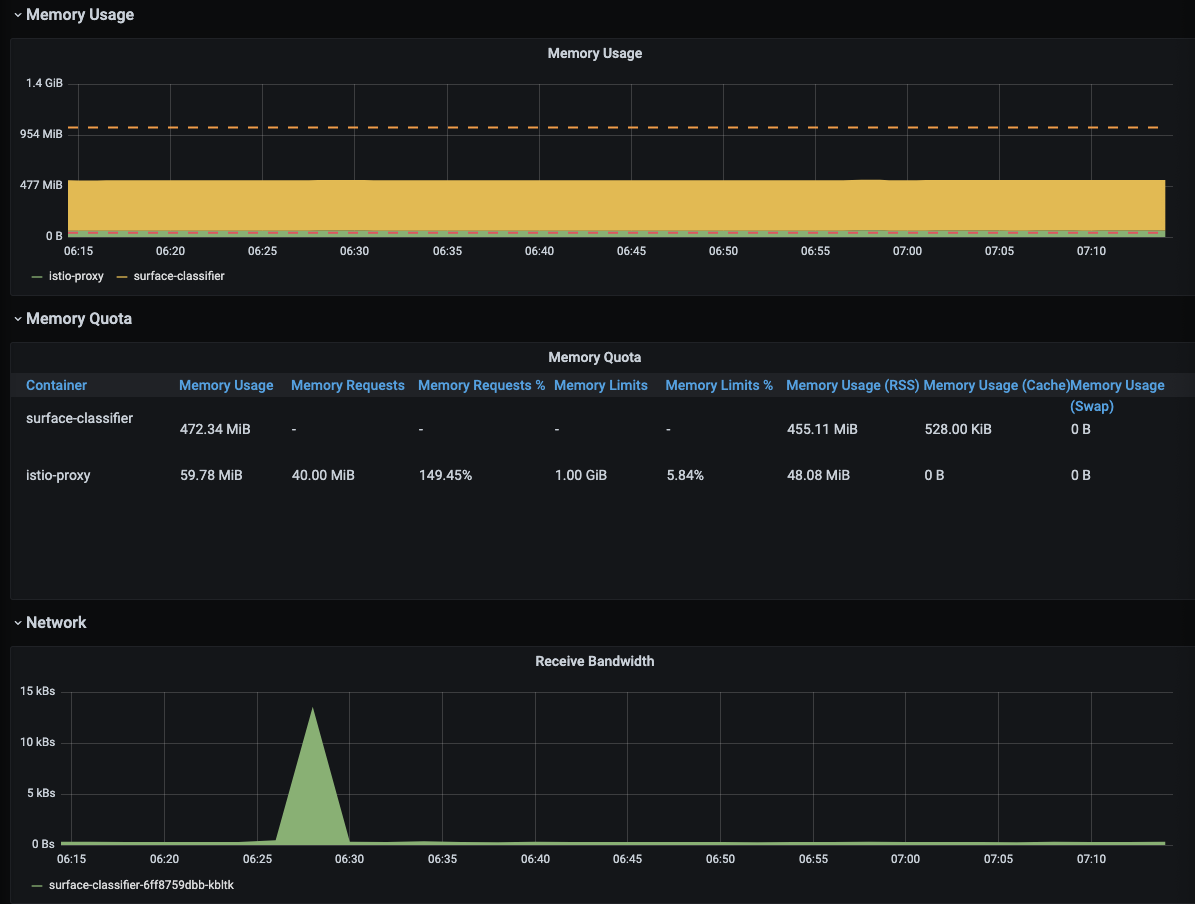 위에서 배포한 surface-classifier-6ff8759dbb-kbltk pod에 대한 리소스 정보를 가져왔다. 이와같이 grafana는 원하는 pod, service, namespace는 물론 클러스터및 노드에 대한 리소스 정보를 시각화 해주고 이것을 사용자에 맞게 커스터마이징 할 수 있다는 장점이 있다.
