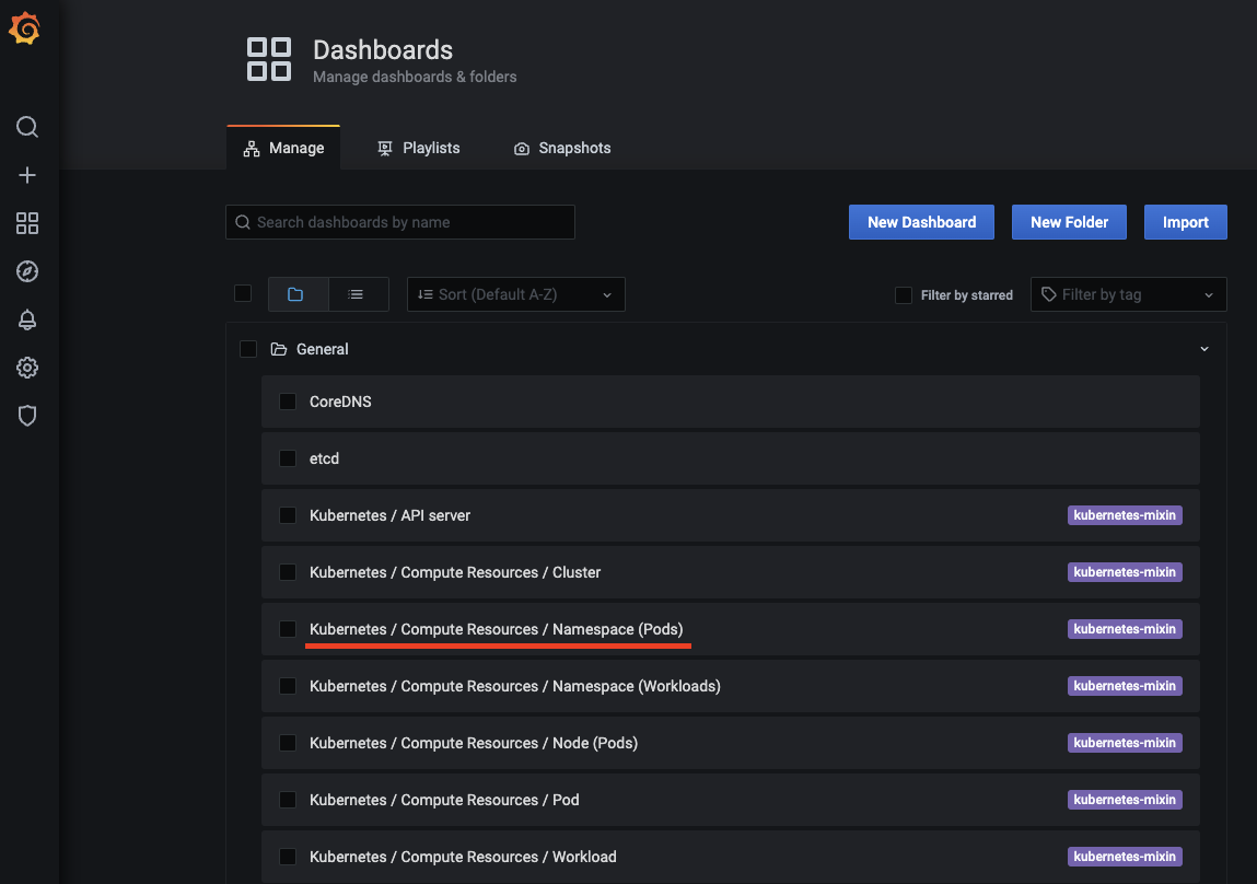 grafana에서 대부분의 쿠버네티스 리소스는 위 Manage 메뉴에서 관리할 수 있다. 위에서 kubeflow-user-example-com에 배포한 모델에 대한 리소스를 확인해보자