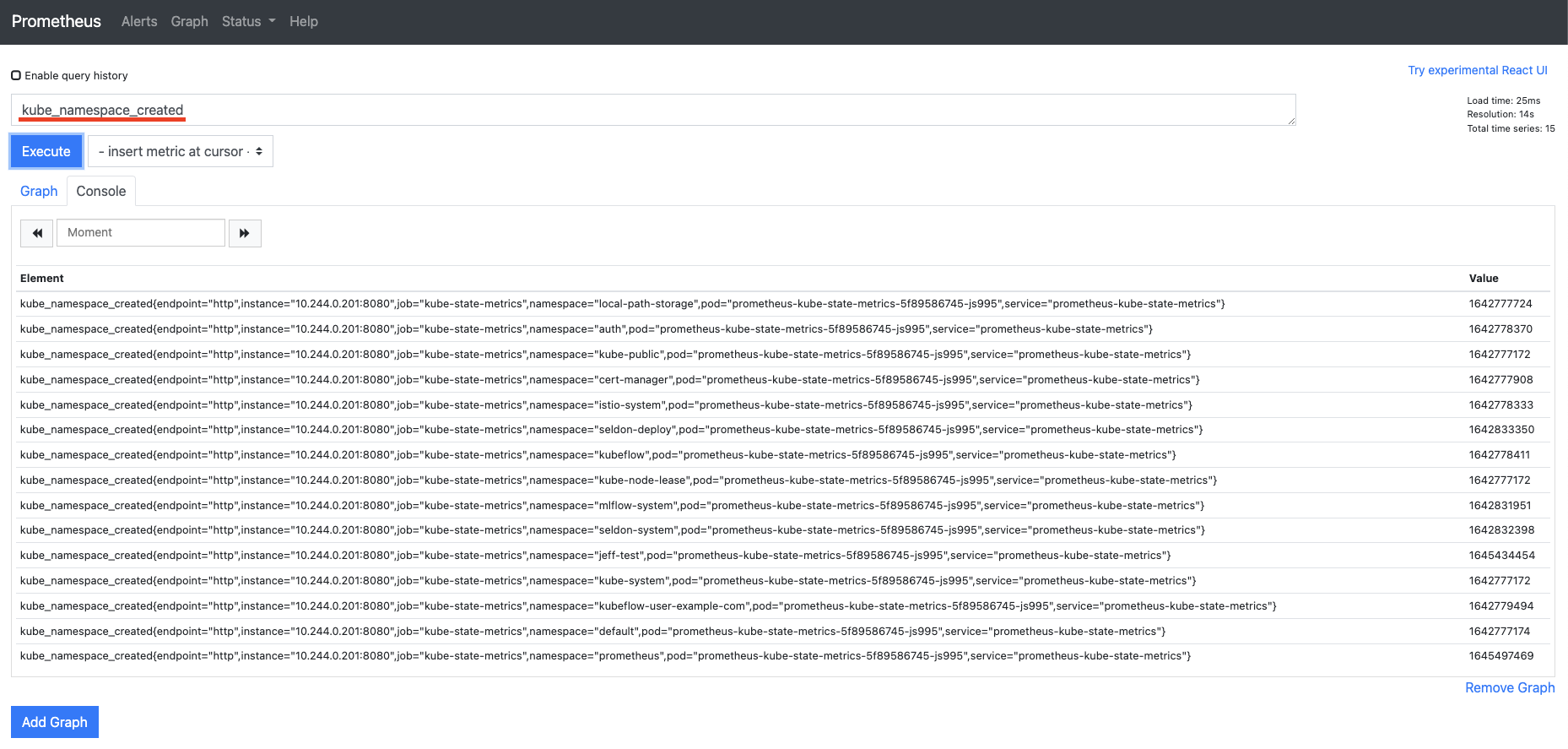 prometheus UI에서 쿼리(밑줄)를 작성할 수 있는데 위와같이 'kube_namespace_created'를 excute하면 현재 생성되어있는 네임스페이스를 출력하게 된다.