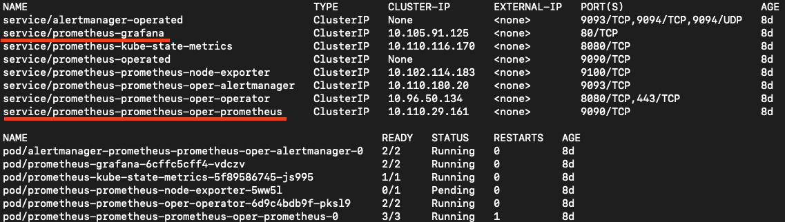 prometheus라는 이름으로 네임스페이스를 생성한 뒤 설치를 진행했고 service와 pod는 아래와 같다.