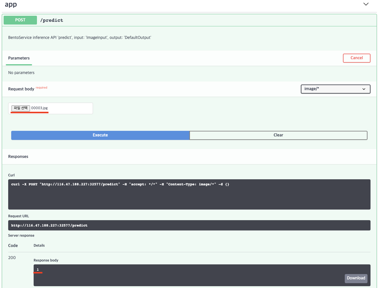 이제 모델이 kubeflow-user-example-com 네임스페이스에 배포되었다. Node Port로 IP를 열었고 해당 주소로 request를 보내거나 직접 접속해 Swagger UI에서 inference를 진행할 수 있다. IP주소에 접속하면 아래 그림과 같이 나오게 되고 우측에 Try it out 버튼을 클릭해 inference를 진행할 수 있다.