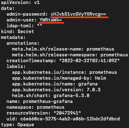 kubectl get secret -n prometheus prometheus-grafana -o yaml