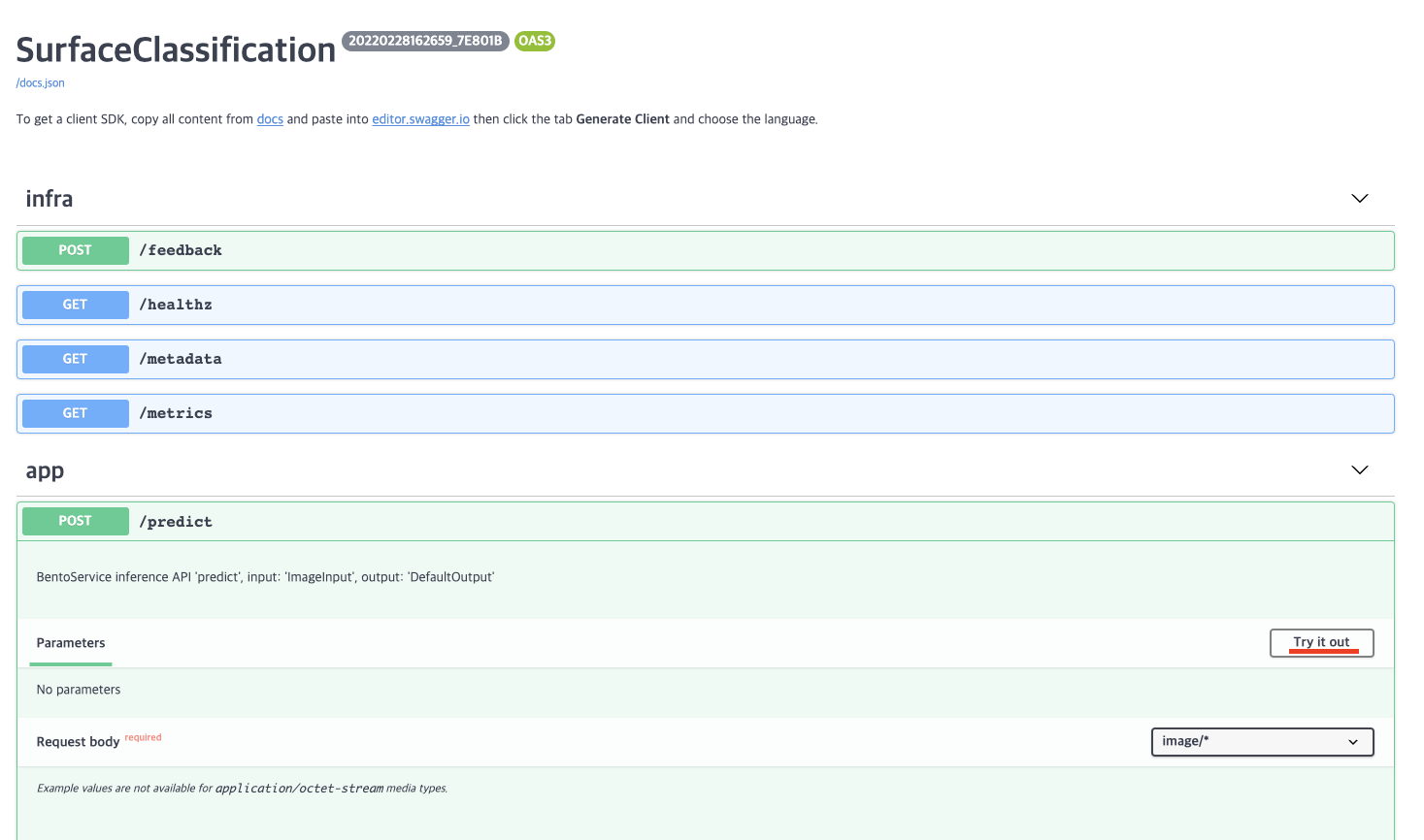 # surface-classifier NodePort {x.x.x.x} <none> 5000:{xxx}/TCP 114s