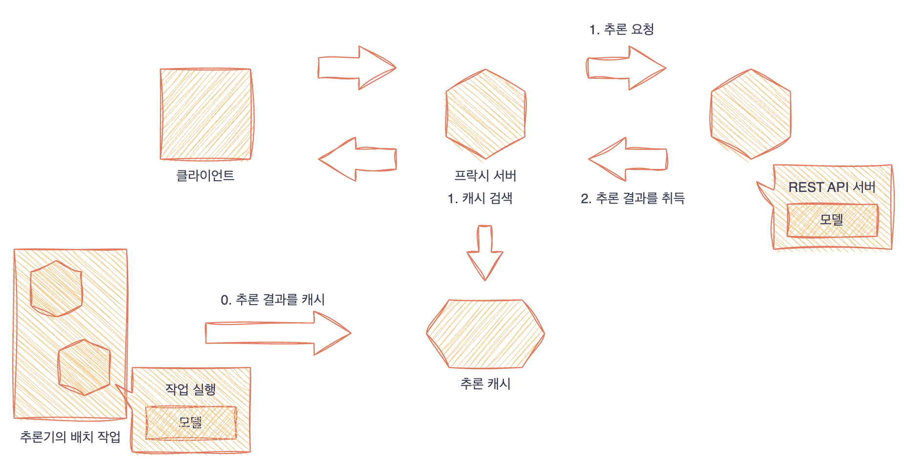 사전에 배치 추론해 놓는 경우는 캐시 대상이 되는 입력 데이터를 사전에 예측할 수 있어야 한다. 검색 시스템이라면 검색 빈도가 높은 키워드 상위 1,000건 등을 캐시해 두는 것을 고려할 수 있다.