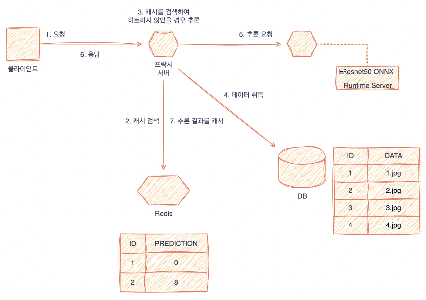추론 요청을 받는 웹 API 서버로 FastAPI, 추론 결과를 캐시해 두는 환경으로는 Redis를 사용한다. 모델은 PyTorch로 학습 완료된 ResNet50 모델을 사용하고 ONNX Runtime Server로 가동한다. 웹 API 서버는 Redis에서 데이터 ID를 검색한 후, 캐시 히트 시에는 그대로 응답한다. 캐시 히트에 실패하면 ResNet50 ONNX Runtime server 로부터 추론 결과를 취득하고 클라이언트에 응답한 후 추론 결과를 Redis에 등록한다.