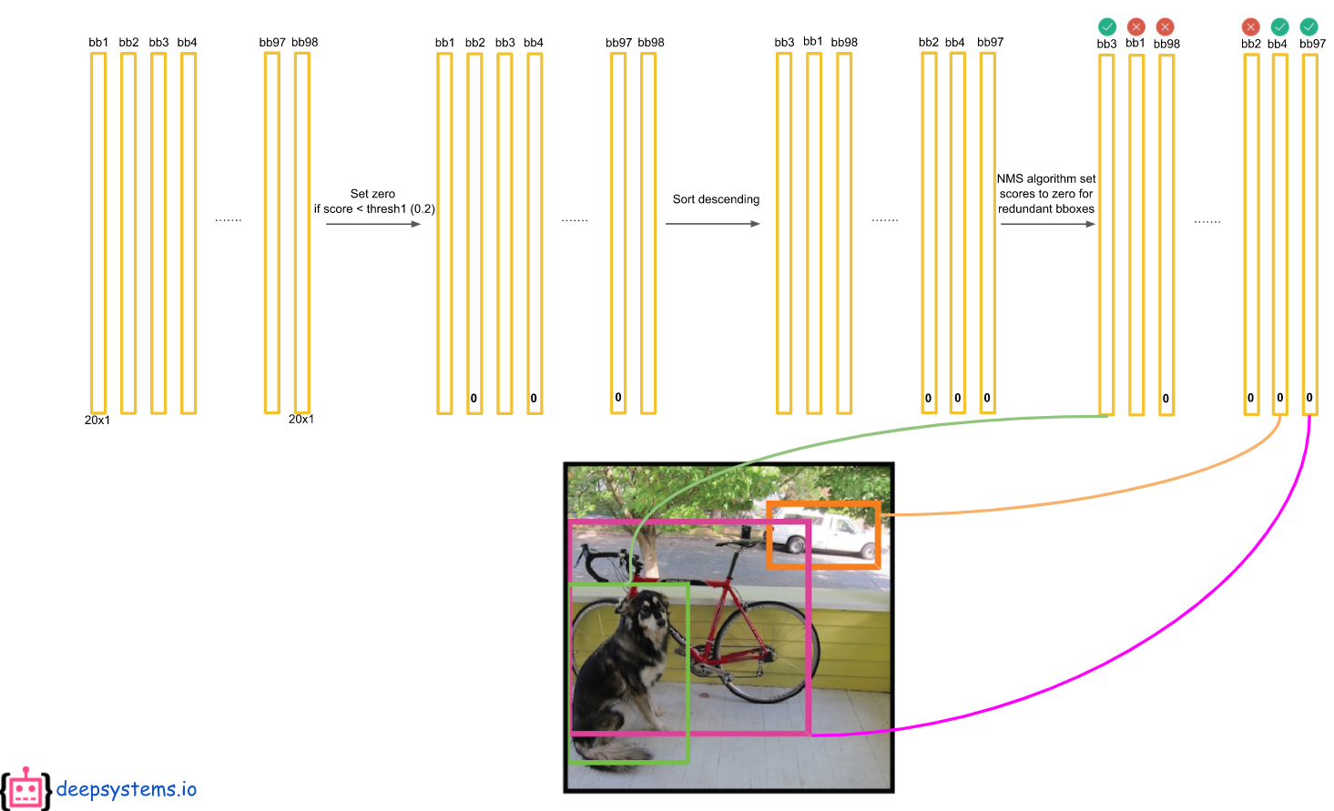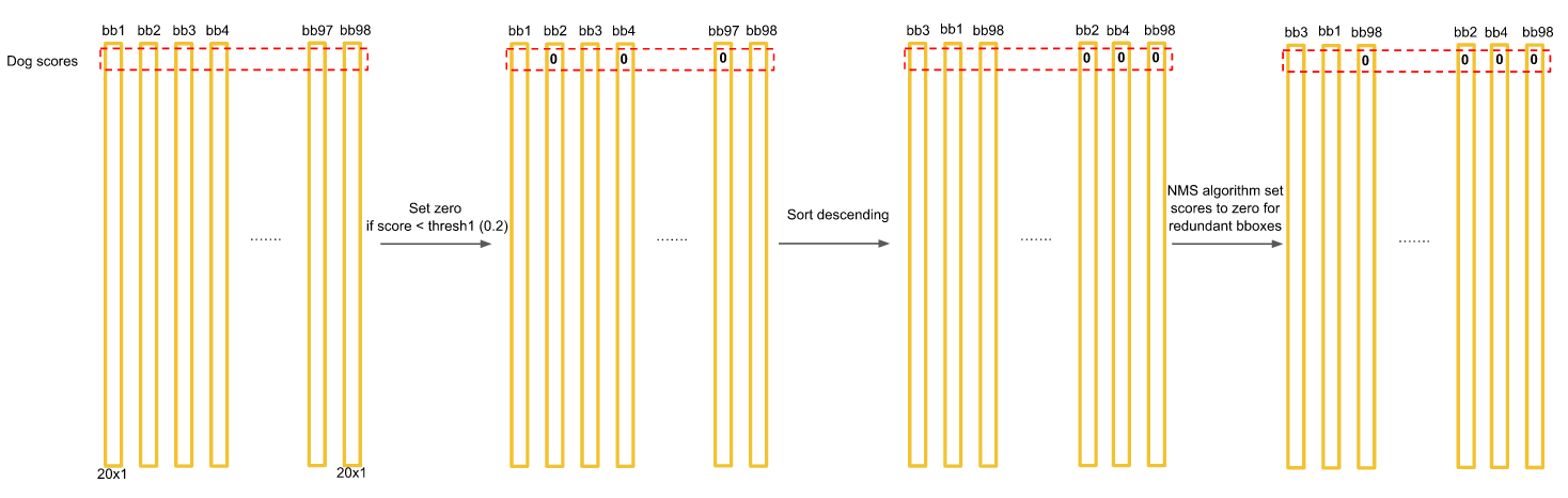 먼저 1440개의 값중에 0.2(Threshold)보다 작은 값들은 모두 0으로 만든다. 그 후에 클래스별로 내림차순으로 정렬을 하고 NMS 기법을 통해서 최종 detection output을 만들어 낸다. NMS는 아래 포스팅에서 자세히 다뤘으니 넘어가겠다.
