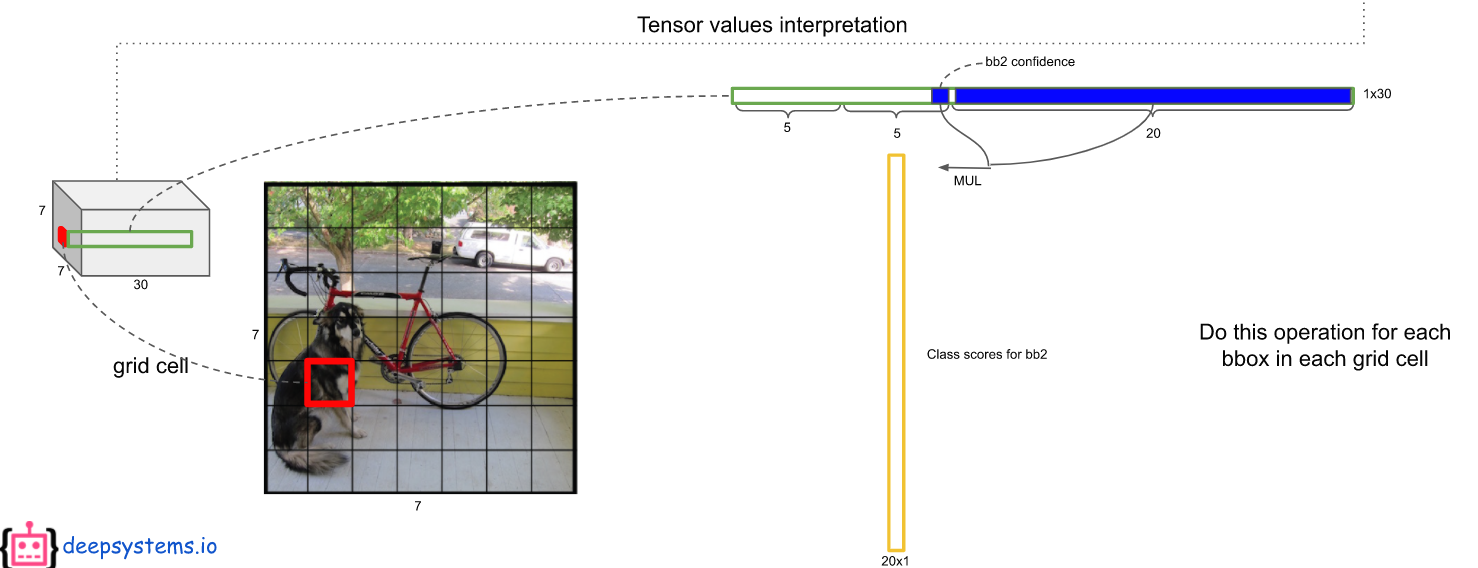 모델의 최종 feature map은 7 x 7 x 30의 사이즈를 가지고 있게 되고 이것을 49개의 영역의 grid cell로 보고 각 grid cell에서 2개의 bounding box와 class를 예측을 하게 된다.